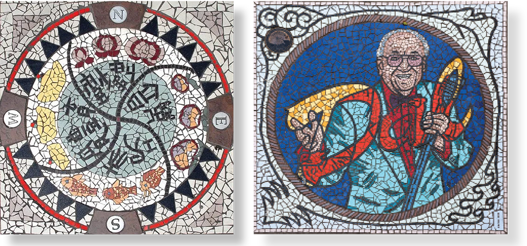 One of the mosaics tributes Dal Richards — a Vancouver legend. With a career spanning over a half century, and with all of the charisma and style it takes to be a Big Band leader, Dal is an icon of Vancouver’s music scene. The success of his impressive orchestra, boasting an amazing five-night-a-week 25-year run at the Panorama Roof of the Hotel Vancouver and 25 years of live CBC National Radio broadcasts, has led to friends and fans affectionately dubbing him “Dr. Swing.”