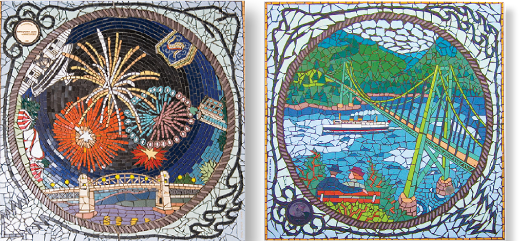 Some of the other mosaics feature historic Granville Street’s entertainment district awash in the neon glow of the 1950s, the Hudson’s Bay Company circa 1670, tributes to notable architecture including the 1929 nurse from the Art Deco Georgia Medical Dental Building, and the Princess Marguerite II, a historic steamship, passing under the Lions Gate Bridge.